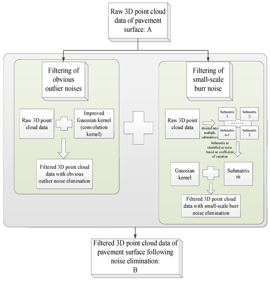 General detection algorithms often prioritize image quality enhancement as a key preprocessing step [37]. As shown in Figure 9a, the original 3D image contains substantial outliers and impulse noise. To address this, the study drew on the method in Reference [37], applied threshold filtering, combining the advantages of median and Gaussian filtering, to process the original image and improve its quality. The specific flowchart of the filtering technique is shown in Figure 10. A comparison of the pavement texture images before and after preprocessing demonstrates that the noise within the red circles in Figure 9a is eliminated, whereas the detailed texture information is preserved.