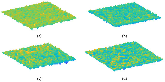 Figure 14. Three-dimensional image of pavement texture construction: (a) Cheng’an-Yu Ginkgo Bridge; (b) Shaxi Woye Bridge; (c) Xindu Golden Phoenix Bridge; (d) Yurui Bridge.
