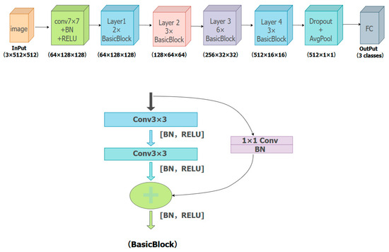 The weight update method adopted for model training is the Adam optimizer, which combines backpropagation and gradient descent to achieve the update. A learning rate scheduler was implemented, where the learning rate is halved (multiplied by 0.5) if the model’s performance on the validation set does not improve within 3 epochs. This approach helps avoid oscillations during steady periods or at local optima. The minimum learning rate was set to 1 × 10−6, and the optimal training parameters were obtained through repeated parameter tuning. To improve generalization and prevent overfitting, a dropout with a rate of 0.1 was introduced after the final residual block group (Layer4). This randomly disables a fraction of the neurons during training, forcing the network to learn more robust and distributed representations. In addition, L2 regularization was applied to the fully connected layer to penalize overly large weights, and batch normalization was incorporated after each convolution to stabilize and accelerate training.