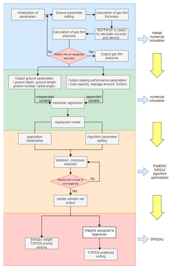where p is the pressure of the sealing gas; R is the sealing radius; ρ is the density of the sealing gas; h is the film thickness; η is the viscosity of the sealing gas; ω is the angular velocity; θ is the circumferential direction; and z is the axial direction. The Reynolds equation is discretized using a five-point finite difference method, with initial conditions set and an iteration precision of 10−6. The final results include load capacity, friction force, and leakage amount. By adjusting the number of spiral grooves, groove width, groove depth, and spiral angle, corresponding values of sealing performance are obtained, and the reasons for these changes are explained and analyzed. Next, nonlinear fitting analysis is conducted, with spiral groove parameters as independent variables and sealing performance as the dependent variable. Subsequently, NSGAII is used for optimization design, with a population size set to 100 and 200 iterations to obtain the Pareto solution set. Finally, the best solution is selected using both subjective TOPSIS and objective entropy weight TOPSIS methods. Details are provided in Figure 2.