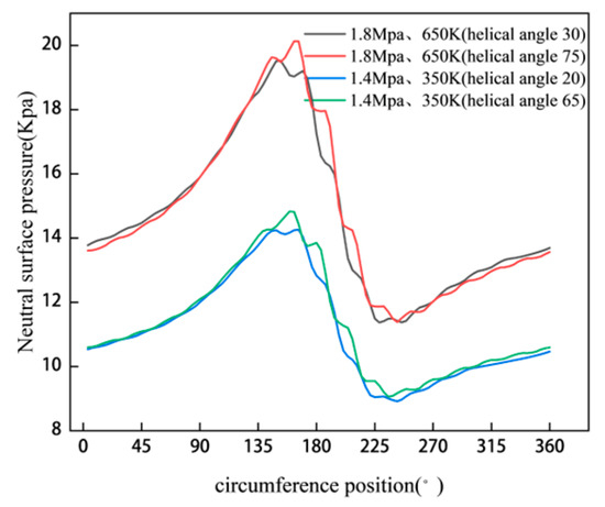 Figure 3 shows the pressure distribution of the gas film neutral surface simulated for two types of spiral grooves under conditions of 1.8 MPa at 650 K and 1.4 MPa at 350 K, which is consistent with the trends observed in the literature [15,16]. From the figure, it can be seen that the pressure reaches its maximum value around the circumferential position of 180 degrees (i.e., near the minimum gas film thickness). This is due to the dynamic pressure effect formed between the rotating and static rings, where the pressure is subjected to the greatest compressive effect near the minimum film thickness.