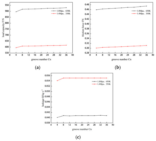 Effect of groove number on sealing performance. (a) The change of gas film load capacity under two working conditions. (b) The change of friction force under two working conditions. (c) The variation of leakage under two operation conditions.