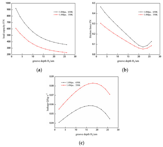 Effect of groove depth on sealing performance. (a) The change of gas film load capacity under two working conditions. (b) The change of friction force under two working conditions. (c) The variation of leakage under two operation conditions.