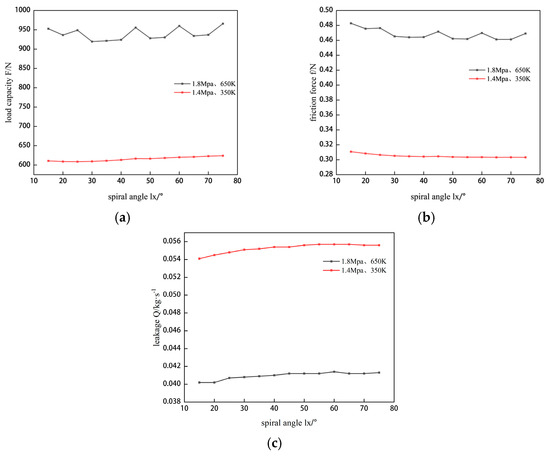 The effects of varying the spiral angle from 15 degrees to 75 degrees in 5-degree increments are studied for two conditions, 1.8 MPa at 650 K and 1.4 MPa at 350 K, with other parameters kept constant, focusing on sealing load capacity, leakage rate, and friction force.