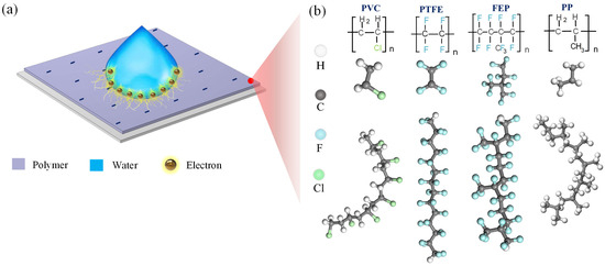 (a) Schematic of water–polymer contact electrification in TENG. (b) Chemical formulas of four polymers.