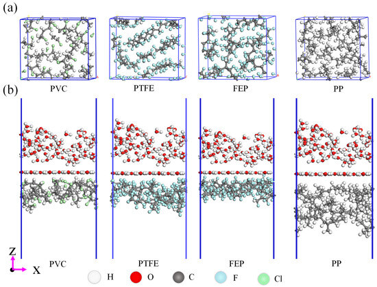 The amorphous polymer models were constructed using the Materials Studio 2020 software program with balanced computational efficiency and structural rationality. The PVC, PTFE, and FEP models each comprise five molecular chains containing seven repeat units. Structural optimization involved (i) 100 annealing cycles (300–800 K) under NVE ensemble, followed by (ii) 1000 ps molecular dynamics relaxation using NPT ensemble. The resulting stable amorphous structures (Figure 2a) exhibit densities of 0.942 g/cm3 (PP), 1.46 g/cm3 (PVC), 2.023 g/cm3 (PTFE), and 2.128 g/cm3 (FEP), showing <5% deviation from experimental values, confirming the model’s validity [41,42].