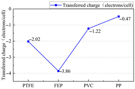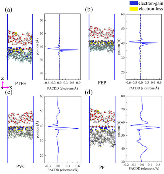 On the basis of clarifying the direction of charge transfer, the charge transfer amount in the polymer segment along the z-direction was compared with the interface center as the reference. This enabled a further analysis of the differences in contact electrification performance between these four distinct polymers and water. It can be seen from Figure 3 that PP, FEP, PTFE, and PVC all carry negative charges after contact electrification with the water layer, and their electron capture capabilities follow the order of PP < PVC < PTFE < FEP. Since the main chain elements of these four amorphous polymers are identical, with only differences in the functional groups contained in the side chains, it can be concluded that the presence of different functional groups in amorphous polymers has distinct effects on the charge transfer after contact with the water layer. It can be intuitively observed from Figure 3 that the electron capture capability of PP without halogen-containing functional groups is far lower than that of PVC, PTFE, and FEP with halogen-containing functional groups. Specifically, the functional group of PVC is Cl, while the functional groups of both FEP and PTFE contain fluorine. It can be thus inferred that polymers with F groups exhibit stronger capture capabilities. An analysis of PTFE and FEP reveals that FEP contains more F groups, which also indicates that a higher content of F groups leads to a stronger charge transfer ability. This conclusion is consistent with the influence of functional groups on contact electrification between amorphous polymers and metals.