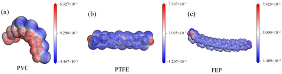 The electrostatic potential of (a) PVC, (b) PTFE, and (c) FEP.