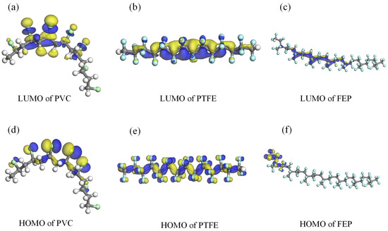 The lowest unoccupied molecular orbitals (LUMOs) of (a) PVC, (b) PTFE, and (c) FEP. The highest occupied molecular orbitals (HOMOs) of (d) PVC, (e) PTFE, and (f) FEP.