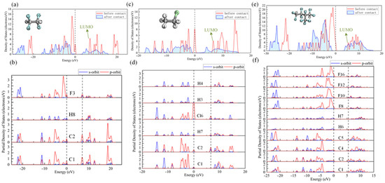 The DOS spectra of pristine (before-contact) samples (Figure 7a,c,e) exhibit sharp, discrete characteristic peaks, reflecting the typical strong electron localization properties of insulating materials. Among these, the first peak above 0 eV corresponds to the LUMO energy level of each material, with the Fermi level defined as 0 eV. A further PDOS analysis (Figure 7b,d,f), combined with the atomic numbering indicated in the upper-left corner of the DOS plots, enables the precise identification of the atomic orbital contributions to the LUMO.