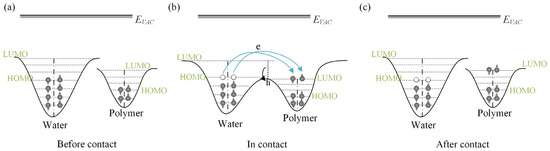 The relationship between the LUMO and HOMO energy levels of water and polymer: (a) before contact, (b) in contact, (c) after contact electrification.