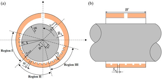 The water inlet is defined as the starting point at 0, with the inner wall surface being segmented in a counterclockwise direction. Using the maximum and minimum water film thickness as the boundary, texture regions are divided starting from 105 at intervals of 60, resulting in three regions: Region I (Convergent Zone: 75135), Region II (Divergent Zone Outlet: 135195), and Region III (Divergent Zone Body: 195255°), as shown in Figure 3.