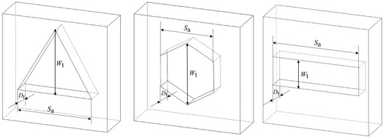 Inspired by the friction-reducing properties of biological skin, this study selected three types of biomimetic micro-textures: triangular (snakeskin-like), linear groove (earthworm skin-like), and hexagonal (lizard skin-like), as illustrated in Figure 4. The animal images in Figure 4 were generated by Chatgtp-4.0 (v4, OpenAI, San Francisco, CA, USA) to assist in expressing the configuration concept. The images were strictly selected by the team to be in line with the actual situation and are only used as an image enhancement method. To eliminate the influence of texture volume, the surface area and depth of the three micro-textures were kept identical. Schematic diagrams and specific parameters are provided in Figure 5 and Table 2.