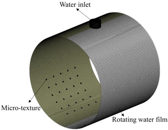 The water film model was developed using SolidWorks (v2021, Dassault Systèmes, Vélizy-Villacoublay, France). The parameters for the bearing model parameters are detailed in Table 1. After the water film model was built, the solid model was imported into Fluent (v2021 R1, ANSYS Inc., Canonsburg, PA, USA). The slice command was used to separate the water inlet from the textured part. Subsequently, the multi-zone method was applied in the meshing process, and the rotating water film was meshed with appropriate sizing for both the water inlet and the micro-textured regions. In the end, a mesh quality inspection was conducted. The geometric model is shown in Figure 6.