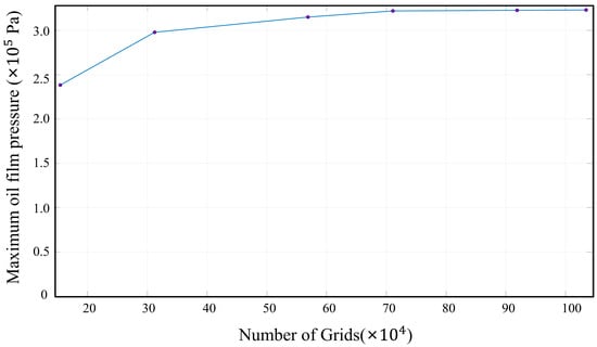The minimum water film thickness observed within the bearing cavity is 18.0 μm, while the bearing width measured at 90.0 mm, resulting in a significantly elevated width-to-diameter ratio. To ensure that the computational mesh remains undistorted and the simulation maintains stability, a globally structured hexahedral mesh was adopted, as shown in Figure 7. The fluid domain model was meshed in ANSYS Workbench (v2021 R1, ANSYS Inc., Canonsburg, PA, USA). A mesh convergence analysis was conducted to establish an optimal balance between accuracy and computational efficiency.