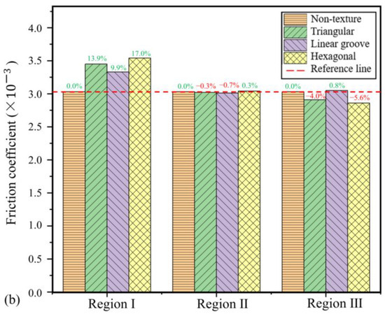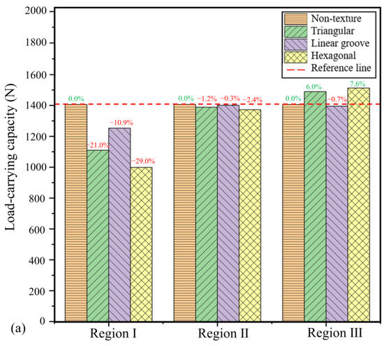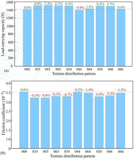 Comparison of micro-textures in a single region: (a) load-carrying capacity; (b) friction coefficient.