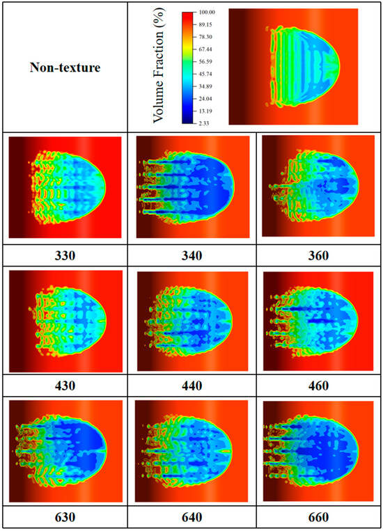 The coupling of micro-textures in Region I and II exhibits detrimental effects on the bearing performance. The implementation of triangular, linear groove, and hexagonal textures collectively led to the decrease in load-carrying capacity and the increase in friction coefficients. As shown in Figure 13, the micro-texture coupling present in Regions I and II weakens the dynamic pressure effect of the bearing, with the majority of the static pressure curve profiles exhibiting values lower than those observed in the non-texture. Furthermore, the analysis of cavitation depicted in Figure 14 reveals that the cavitation zone of the water film is situated nearer to the high-pressure zone, suggesting a more significant and severe occurrence of cavitation. Specifically, in the cases of 340 and 660, the degree of cavitation is extremely high and relatively concentrated, resulting in a significant decline in the load-carrying capacity. This coupling mechanism demonstrates a significant negative influence on the tribological characteristics.