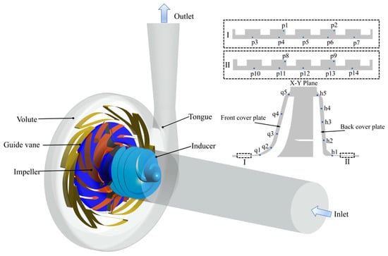 where p(ti) is the pressure value at ti moment, t0 is the start time of sampling, is the time-averaged pressure value at a sampling point, ρ is the density of the fluid medium, and u is the tangential velocity at the impeller outlet. The obtained pressure coefficient is then transformed into the frequency domain using FFT (Fast Fourier Transform), with the distribution of monitoring points depicted in Figure 1. The impeller speed is 9685 rpm, with the shaft frequency fr = 161.41667 Hz and the blade passing frequency fBPF = 968.5 Hz.