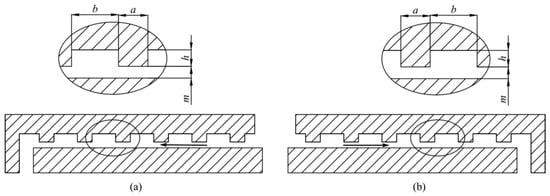 Figure 2 illustrates the cross-section of the seal ring, with arrows indicating the direction of fluid flow inside the ring. Where a is tooth width, b is cavity width, h is tooth height, and m is gap width. To investigate the influence of labyrinth seal ring tooth profile on the pressure pulsations in the centrifugal pump leakage chambers, the study was designed based on the single-variable control principle. Four groups of seal ring structural parameters with different tooth heights were designed, as shown in Table 2. The minimum tooth height is 0.13 mm and the maximum is 0.28 mm. The tooth height was increased by 0.05 mm for each iteration to better capture the nonlinear effects of pressure pulsations.