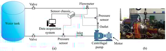 Figure 3a shows the experimental system of the centrifugal pump used in this study, which primarily aims to obtain performance characteristic curves of the centrifugal pump to validate the feasibility of numerical calculations. The experimental system includes a pressure sensor, water tank, valves, flow meter, centrifugal pump, and piping. Figure 3b presents the experimental device, where multiple tests were performed under identical conditions and flow rates. It is necessary to calculate the average value of the measured data. By introducing the theoretical analysis of experimental measurement uncertainty, calculate the uncertainty through Equations (1) and (2) []. Table 3 shows the measurement uncertainties of each parameter.