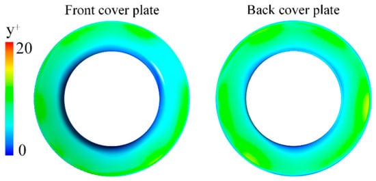 Distribution of y+ on the front cover plate and the back cover plate.