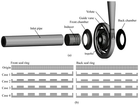 Mesh details of the model pump and seal ring, (a) global mesh, (b) mesh detail at seal rings.
