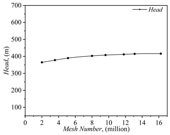 In this study, we performed mesh independence verification of the adopted centrifugal pump model, dividing the mesh into eight different densities, and steady-state solutions were carried out for each mesh to obtain corresponding head data, as shown in Figure 6. When the mesh number exceeds 13.3 million, the calculated head values stabilize, indicating that further increasing the mesh density has no significant effect on the head calculation results. Considering the balance between computational accuracy and resource requirements, a mesh of 13.3 million elements was selected as the final mesh density for subsequent simulation calculations.