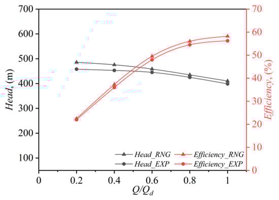 Figure 7 presents the pump performance characteristics, which are derived from a comprehensive analysis of experimental data and numerical simulation results. In this study, we conducted calculations on the prototype model across different flow conditions ranging from 0.2Qd to Qd and averaged the simulation results to obtain the mean values of head and efficiency. These values were compared with experimental data. At the rated flow Qd = 130 m3/h, the calculated head was 410.32 m, while the experimental measurement was 400 m, with an error of 2.58%. The calculated efficiency was 58.21%, while the experimental efficiency was 56.23%, with a small error of only 3.52%. Although discrepancies exist between the numerical and experimental results at specific points, the overall trend of the simulated characteristic curves aligns well with experimental data, validating the reliability of the adopted numerical methodology for subsequent analyses. Based on this, the subsequent computational studies were conducted under design flow conditions.