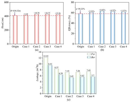 The performance of pumps with different seal ring structures: (a) head, (b) efficiency, and (c) leakage rate of the seal ring.