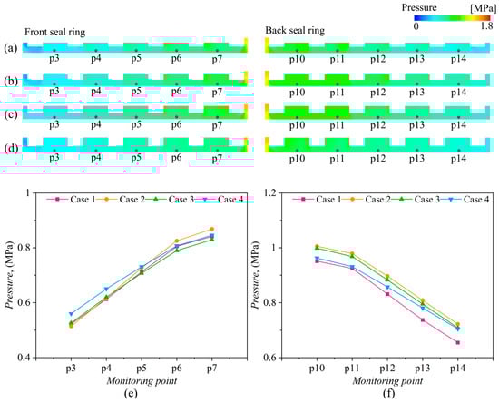 Pressure distribution of seal rings: (a) Case 1, (b) Case 2, (c) Case 3, and (d) Case 4, (e) pressure graph of the front seal ring, and (f) pressure graph of the back seal ring.
