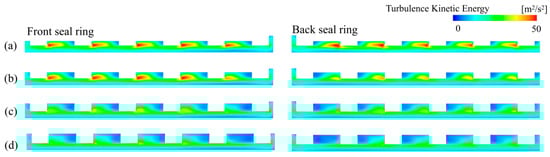 Turbulence kinetic energy distribution of seal rings: (a) Case 1, (b) Case 2, (c) Case 3, and (d) Case 4.