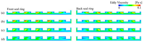 Eddy viscosity distribution of seal rings: (a) Case 1, (b) Case 2, (c) Case 3, and (d) Case 4.