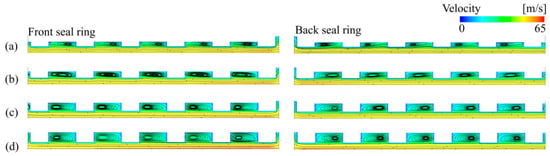 Vorticity distribution in seal rings: (a) Case 1, (b) Case 2, (c) Case 3, and (d) Case 4.