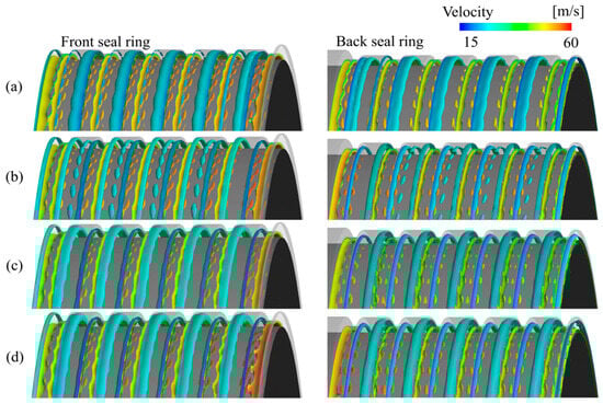 Figure 13 shows the vorticity distribution of the front and back seal rings. In Case 1, the vortex structure is relatively regular. In Case 2, with the increase in tooth height, independent small vortices begin to form. In Case 3 and Case 4, the vortex structure becomes more concentrated. In Case 4, it is evident that the velocity increases significantly, reflecting that the increase in tooth height leads to stronger leakage vortex intensity and higher local flow losses. The change in the inlet ring structure also has a certain impact on the chamber inside, and we need to further analyze the vortex structure inside the chamber.