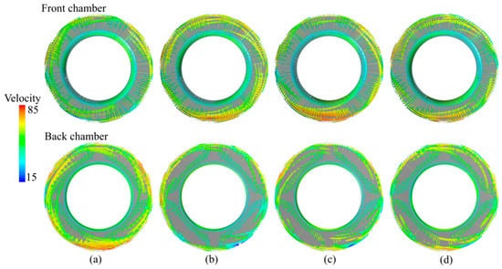 Figure 11 shows the eddy viscosity distribution of the front and back seal rings of the centrifugal pump. In Case 1 and Case 2, where the tooth height is relatively low, the high eddy viscosity regions have values close to 0.1 Pa·s, and their distribution range is quite large. The contour map indicates that turbulence in the fluid is strong in this region, with intense fluid vortex motion and significant energy dissipation. when the tooth height is low, the constraining and guiding capabilities of the tooth on the fluid are relatively weak, resulting in more vortices and easily triggering strong turbulence. In Case 3 and Case 4, where the tooth height is relatively high, it is clearly observed that compared to Case 1 and Case 2, the areas with high eddy viscosity are significantly reduced. This is because the higher tooth height alters the flow passage structure, enhances the guiding effect on the fluid, and suppresses the occurrence of large-scale flow separation, thus stabilizing the internal flow field of the tooth ring. Increasing the tooth height can also effectively prevent the formation and development of larger-scale vortices, reduce the transfer of turbulent fluctuation energy to smaller-scale vortices, and lower the eddy viscosity. At this point, the orderliness of fluid flow is improved, and energy dissipation is reduced. The above eddy viscosity analysis reveals the turbulence spatial characteristics of the flow field inside the seal ring. The distribution of eddy viscosity, as the medium transmitting turbulent stresses, directly influences the velocity distribution. Further analysis of the velocity field distribution allows for a quantifiable evaluation of the impact of turbulent transport on the leakage flow dynamics of the centrifugal pump.