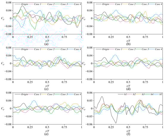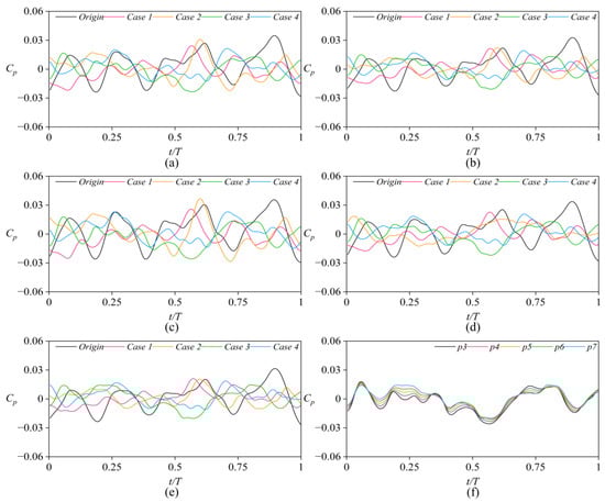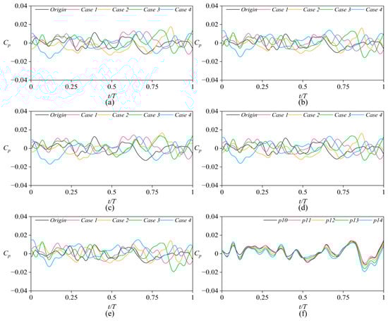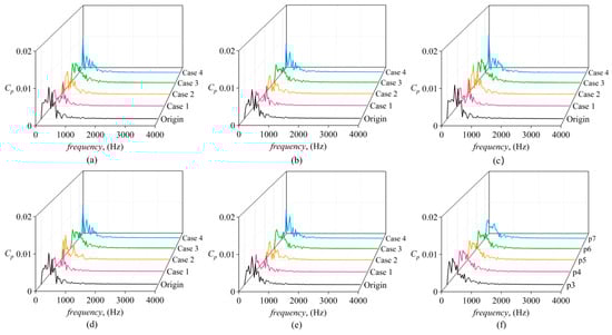 Figure 15 presents the time–domain plot of the pressure coefficient at the front seal monitoring points. We can see that the black line (Origin) fluctuates to a relatively large extent, while the fluctuations in other cases are somewhat reduced. Additionally, changes in the seal ring also influence the phase of these fluctuations. The pressure pulsation within the same case is very similar, as shown in Figure 15f.