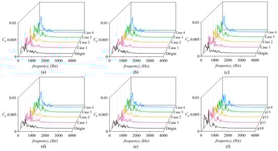 Figure 18 presents the frequency–domain plots of different monitoring points at the back seal ring. Overall, the pressure pulsation of the back seal ring is clearly lower than that of the front seal ring, with a slight increase in high-frequency fluctuations. Compared to the Origin case, Cases 1, 2, and 3 show slight increases in the pressure pulsation, while Case 4 exhibits a more significant increase, with the maximum amplitude reaching 0.0057. As the tooth height increases, the pressure fluctuation amplitudes at frequency fr are as follows: 0.00323, 0.00142, 0.00273, and 0.00382, with Case 2 having the smallest amplitude. Figure 18f compares the pressure pulsation at different monitoring points in Case 3. In the plot, a peak value is observed at 403.54 Hz at all monitoring points, with p10–p14 gradually decreasing. Two distinct and independent peaks are observed at 766.73 Hz and 847.44 Hz, with values gradually increasing from p10–p14.