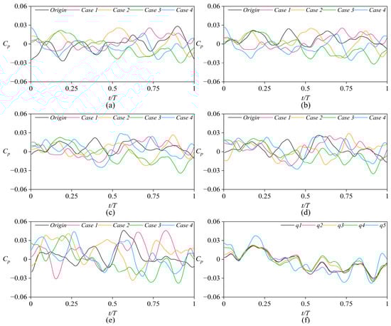 Time–domain pressure coefficient of the front chamber for monitoring points (a) q1, (b) q2, (c) q3, (d) q4, (e) q5, and (f) monitoring points of Case 3.