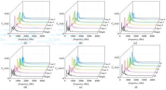 Figure 19 presents the time domain plot of the pressure coefficient at the front chamber monitoring points. The q5 curve in (f) shows a slight deviation from the pressure pulsations at other monitoring points, as the q5 point is located closer to the guide vane and is more affected by it than the other points. Figure 20 shows the pressure pulsation frequency–domain plot of the five monitoring points in the centrifugal pump front chamber. It can be observed from the diagram that there is no obvious regularity in the pressure pulsations inside the Origin structure, with the curve fluctuating chaotically, which also reflects the more turbulent flow field in the front chamber without the seal teeth, indicating stronger flow disturbances. Compared to the Origin, other cases show higher pressure pulsation amplitudes in the 0–500 Hz range, but after 500 Hz, the amplitude of the pressure pulsation improves.