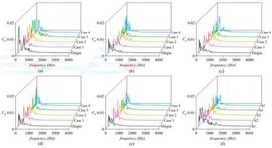 Figure 22 shows the pressure pulsation frequency–domain plot for five monitoring points in the centrifugal pump back chamber. Overall, as the tooth height increases gradually in Case 1, Case 2, and Case 3, the pressure pulsation amplitude in the frequency–domain shows little variation. When the frequency is between 1000 Hz and 2000 Hz, the pressure pulsation amplitude in the back chamber is higher than in the front chamber. Therefore, when optimizing the back seal ring structure, it is necessary to consider not only suppressing low-frequency amplitudes but also addressing the high-frequency region. Figure 22a shows the frequency–domain plot of pressure pulsation at monitoring point h1. In Origin, the highest amplitude of 0.0167 occurs at 80.71 Hz, while the amplitudes under other working conditions are relatively low, indicating that the structural changes of the sealing ring have affected the flow characteristics of the leakage stream. In Figure 22b, Case 4 exhibits a prominent peak at 121.062 Hz with an amplitude reaching 0.01186. In Figure 22c, the pulsation amplitudes of Case 2 and Case 3 are relatively low, while Case 4 exhibits a peak amplitude of 0.0116 at 363.19 Hz. In Figure 22f, by comparing the monitoring points in working condition 3, it can be observed that monitoring point h1 exhibits two relatively high peaks. This may be attributed to the fact that the h1 location is closer to the guide vanes and thus more susceptible to the influence of high-energy fluid pressure fluctuations. The amplitudes at other monitoring points are around 0.006, and the pressure pulsation behavior is similar.