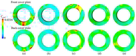Pressure pulsation intensity distribution of front and back cover plates: (a) Origin, (b) Case 1, (c) Case 2, (d) Case 3, and (e) Case 4.