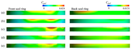 Pressure pulsation intensity distribution of the front and back seal rings: (a) Origin, (b) Case 1, (c) Case 2, (d) Case 3, and (e) Case 4.