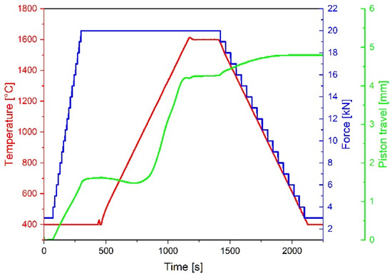 Both composites were sintered in an identical cycle on an HP D 5 (FCT Systeme, Effelder-Rauenstein, Germany) apparatus in a 20 mm-diameter graphite die (lined with graphite foil) in an argon atmosphere (≈500 Pa after evacuation to ≈5 Pa). A representative sintering-cycle record is shown in Figure 1. The cycle included preheating (to 400 °C, dwell ≈ 5 min), main heating (ramp to 1600 °C over 720 s, ≈100 °C min−1), isothermal dwell (4 min at 1600 °C), and controlled cooling (to 400 °C over 720 s, ≈100 °C min−1). The uniaxial force was ramped to 20 kN (≈63 MPa) and maintained during heating and dwell. The bulk density of the sintered samples was measured using the Archimedes method in distilled water, in accordance with the standard [20]. The theoretical density (ρ_th) of each composite was subsequently calculated using the rule of mixtures, based on the volume fractions and theoretical densities of the constituent phases: α-Al2O3 (3.98 g/cm3), 3Y-TZP (6.05 g/cm3), WC (15.7 g/cm3), and ZrC (6.73 g/cm3). Finally, the relative density was determined as the ratio of the measured bulk density to the calculated theoretical density. The resulting specimens exhibited a high degree of densification. Specifically, the Al2O3–ZrO2–WC composite achieved a relative density of ≥99%, while the Al2O3–ZrO2–ZrC composite showed a slightly lower relative density of ≥97.5%, which is consistent with the localized porosity observed in its microstructure. The total porosity (P) of the sintered samples was subsequently determined as the complement to the relative density (P = 100% − ρ_rel).
