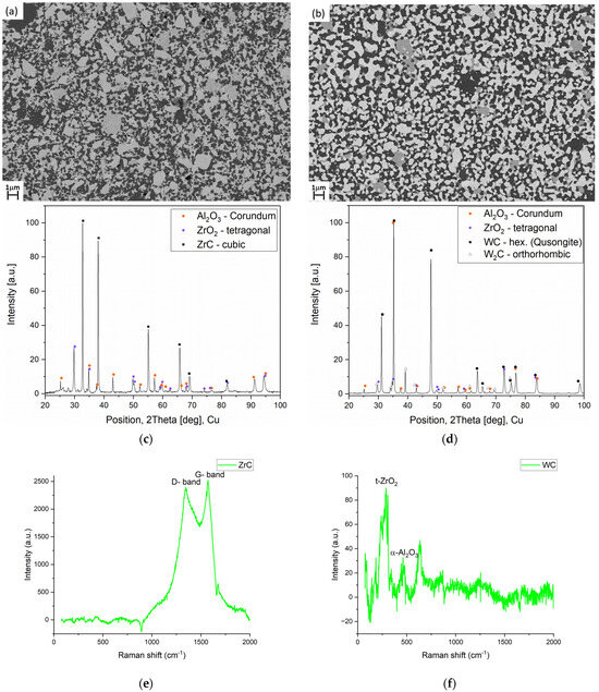 Figure 2a,b SEM-BSE micrographs showing the microstructures of the Al2O3–ZrO2–ZrC and Al2O3–ZrO2–WC composites, respectively. (Figure 2c,d) Corresponding XRD patterns confirm the phase composition. (Figure 2e,f) Raman spectra revealing the presence of disordered graphitic carbon in the ZrC composite (Figure 2e) and its absence in the WC composite (Figure 2f).