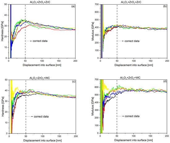 Representative results of nanoindentation measurements: hardness (H) and Young’s modulus (E) as a function of indentation depth: (a) hardness and (b) modulus for the ZrC composite; (c) hardness and (d) modulus for the WC composite.