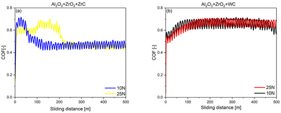In terms of tribological properties, differences between the individual composites can be observed. Figure 4 plots the COF versus sliding distance for both composites at 10 N and 25 N loads. The ZrC-reinforced composite (Figure 4a) achieves a low and stable steady-state COF of approximately 0.46. Notably, under the 25 N load, it shows a brief friction spike between 100 m and 200 m, which likely corresponds to the initial nucleation and densification of the protective tribofilm, before settling into a stable friction regime. Conversely, the WC-reinforced composite (Figure 4b) exhibits significantly higher and more fluctuating friction, with a steady-state COF of around 0.67. Notably, under a 25 N load, it shows a brief friction spike between 100 m and 200 m before settling into a stable friction regime.