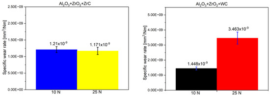 The specific wear rates for the ZrC- and WC-reinforced composites are compiled in Table 4 and plotted in Figure 5. The ZrC composite exhibits the lowest Ws values, with minimal sensitivity to the applied load. In contrast, the WC composite displays a modest WS under the 10 N load but experiences a more than two-fold increase when the load is raised to 25 N.