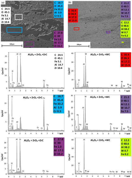 Similarly, for the Al2O3–ZrO2–WC composite, EDX confirmed the presence of the intended phases. The brightest grains were identified as tungsten carbide (approx. 79 wt.% W, 15 wt.% C). The surrounding matrix and interface areas showed a complex mixture of all constituent elements (Al, Zr, W, O, C), confirming the fine, intermixed nature of the microstructure observed in the SEM images.