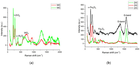Representative Raman spectra from the wear tracks of (a) the Al2O3–ZrO2–WC composite and (b) the Al2O3–ZrO2–ZrC composite.