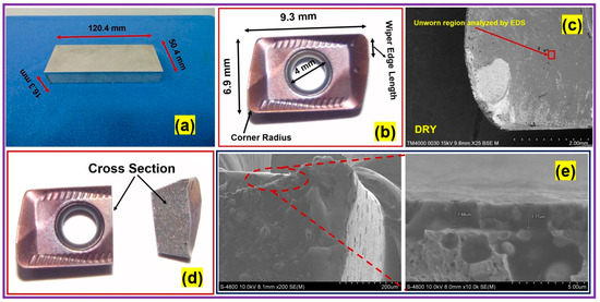(a) Overall dimensions of the Hastelloy C276 rectangular block after laser cutting, used as the workpiece material; (b) geometric dimensions of TiSiN/TiAlN-coated carbide insert, including width, length, wiper edge length, and corner radius; (c) SEM image of the coated insert after dry machining, highlighting the target point on the rake face at an unworn region selected for elemental analysis; (d) cross-sectional view of the coated insert prepared using wire electrical discharge machining (WEDM), used to expose the coating layers for thickness measurement; (e) SEM images of the cross-section used to determine the coating thickness of the TiSiN/TiAlN multi-layer system.